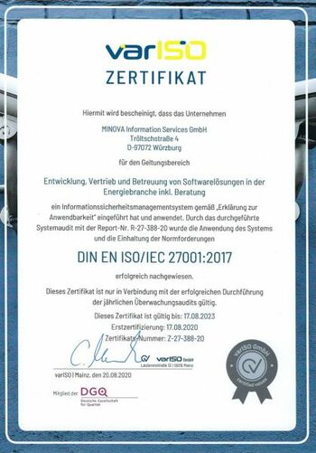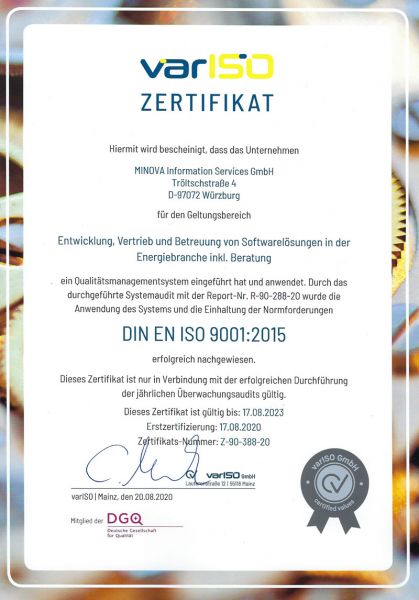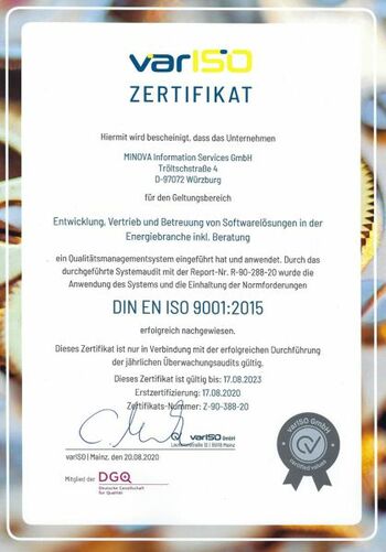 Die Zertifizierungen nach der neuen Qualitätsmanagement-Norm DIN EN ISO 9001:2015 und der Informationssicherheitsmanagement-Norm DIN EN ISO 27001:2017 sind ein weiterer wichtiger Meilenstein in der Erfolgsgeschichte der MINOVA. Wir haben uns den Anforderungen an ein Qualitätsmanagementsystem nach ISO 9001:2015 und an ein Informationssicherheitsmanagementsystem gestellt und sind seit dem 17.08.2020 nach der Norm DIN EN ISO 9001:2015 und der Norm DIN EN ISO 27001 zertifiziert.